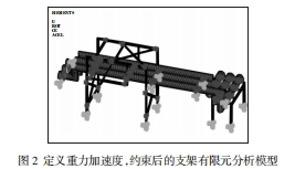 3載荷,綁縛的仿照定義重力加速度9800mm/s2,在支架立柱底端及其他相應方位施加綁縛。如圖2所示,為定義重力加速度,綁縛后的ANSYS仿真圖。