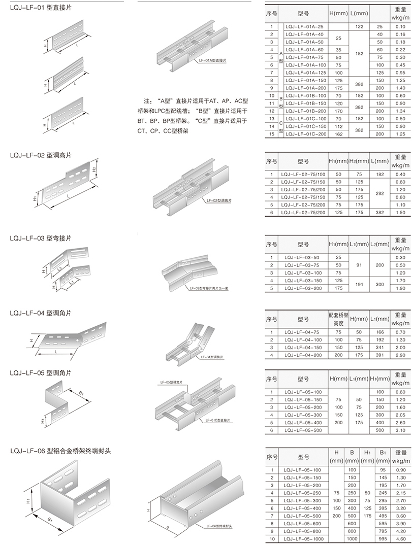 鋁合金電纜橋架在某種結構形式中無其它結構形式中的某-種產品類別,選型可作代用表示。例如:LQU-CC型槽式鋁合金電纜橋架結構形式中,無鋁合金配線橋架中的LPC-03D, 即表示為LFC-CC-03D